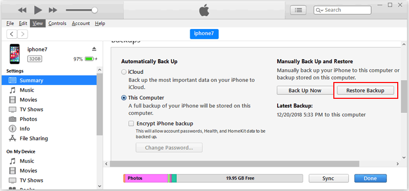 Another backup alternative that you can try to retrieve text messages from a broken iPhone is via iTunes (Windows/macOS Mojave) or Finder (macOS Catalina and later). This method is effective when your iPhone is broken or unresponsive, but you’ve saved recent backups on your computer. All you have to do: