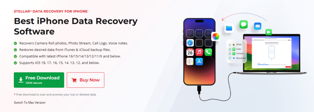 If your iPhone is severely damaged or the aforementioned backups fail to restore your lost text messages, try specialised iPhone data recovery software. Tools like Stellar Data Recovery for iPhone completely scan your broken or non-functional iPhone to extract its content. This all-in-one software enables the recovery of multiple file types, such as photos, videos, documents, text messages, and more.